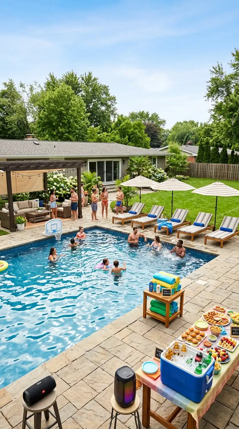 A pool party setup prioritizes safety, comfort, and easy access to water and refreshments. Arrange lounge chairs and umbrellas around the pool for sunbathing, and set up a table with towels, sunscreen, and pool toys. Create a refreshment station with a cooler or beverage tub filled with drinks, and a snack table with easy-to-eat finger foods. Add a music speaker for entertainment, and consider a shaded seating area for guests who want a break from the sun.