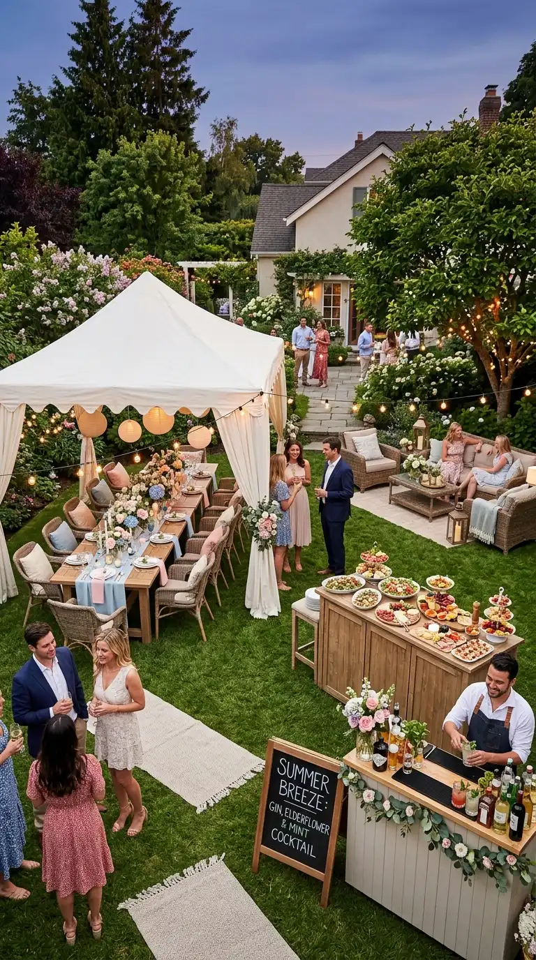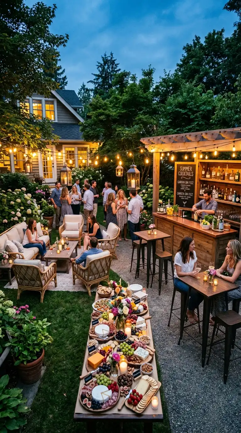 A cocktail party encourages mingling and movement, so focus on creating multiple gathering points rather than one central dining area. Set up a stylish bar with a variety of spirits, mixers, and garnishes. Use high-top tables with stools for standing conversation, and scatter lounge seating around the yard. Serve passed appetizers from trays, or set up a grazing table with artisanal cheeses, cured meats, and fresh fruits. Add ambient lighting with string lights, lanterns, and candles.
