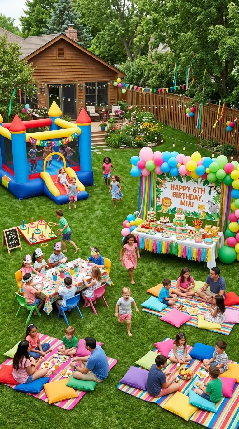 A children’s birthday party setup should be colorful, fun, and organized with activities in mind. Set up a designated activity zone with games like a bounce house, ring toss, or craft table. Arrange a separate food area with a decorated table for cake and snacks. Use picnic blankets or low tables with floor cushions for seating. Add colorful balloons, streamers, and a themed backdrop for photo opportunities. Consider a shade tent or umbrella to protect little ones from the sun.