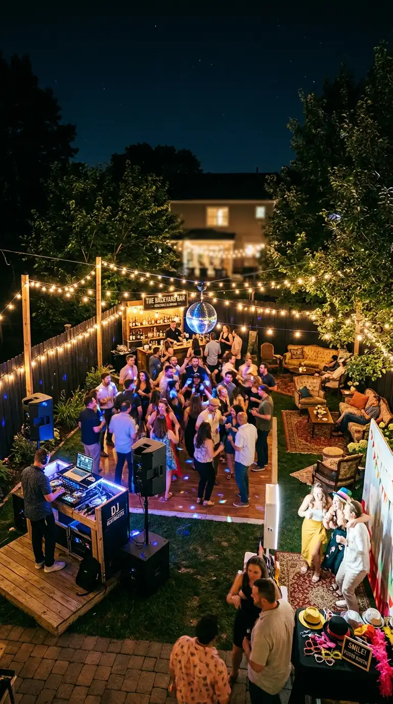 For a lively backyard dance party, create a designated dance floor area with smooth, level surface. Use string lights, uplighting, or a disco ball to set the mood. Set up a DJ booth or speaker system for music, and create a lounge area with seating for guests to rest between dances. A bar with signature cocktails keeps refreshments flowing, and a photo booth with props adds fun and memorable moments.