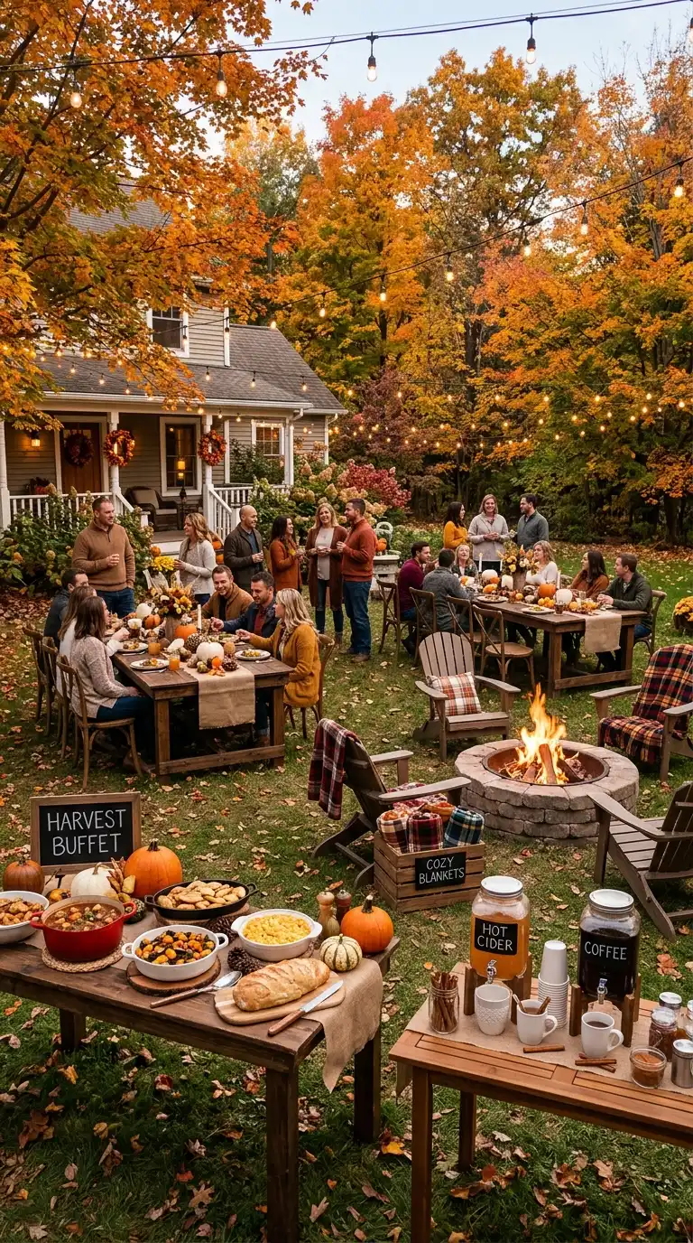 Celebrate the autumn season with a cozy harvest-themed gathering. Use rustic wooden tables with burlap runners, and decorate with pumpkins, gourds, and fall foliage. Serve warm comfort foods like chili, soup, or roasted vegetables from a buffet, and set up a hot beverage station with cider, coffee, and hot chocolate. Add a fire pit for warmth and ambiance, and provide cozy blankets for guests. String warm-toned lights overhead to enhance the seasonal feel.