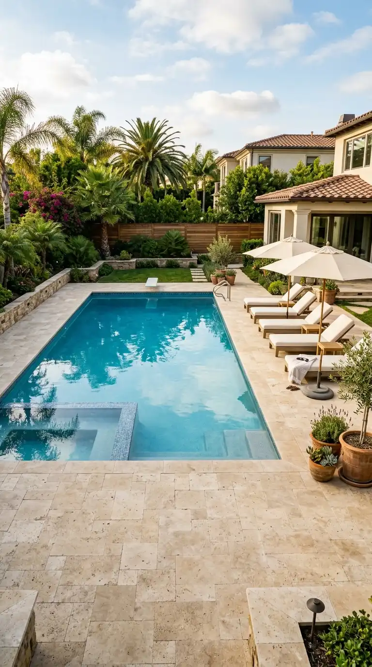 Travertine pavers are a luxurious choice for pool decks and patios. This natural stone has a soft, warm appearance with subtle variations in beige, ivory, and gold. Travertine stays cool underfoot, making it ideal for pool surrounds. It is also slip-resistant and durable. Choose a tumbled finish for a rustic look or a honed finish for a sleek, modern appearance.