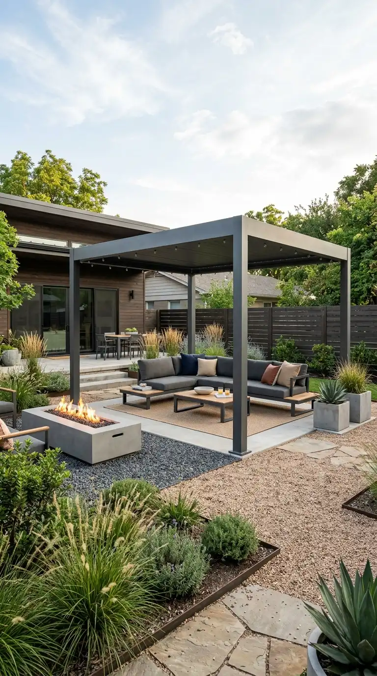 A modern metal pavilion with a flat roof offers a sleek, minimalist aesthetic that complements contemporary architecture. Use steel or aluminum for the frame, and choose a powder-coated finish in black, charcoal, or white. The flat roof can be fitted with a retractable canopy or used to support a green roof. This design creates a clean, open space for lounging, dining, or outdoor entertaining.