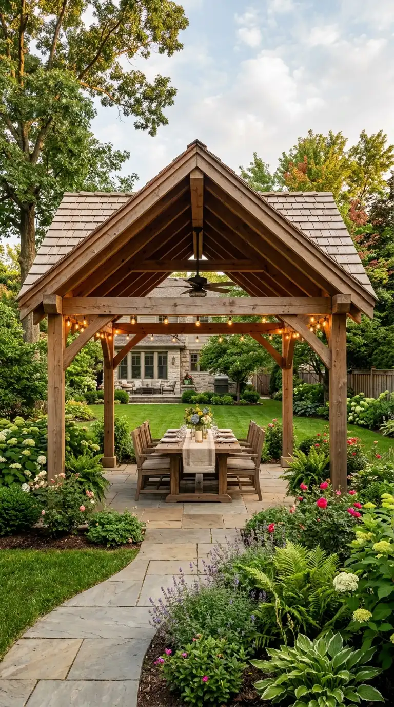 A classic wood pavilion with a gable roof offers timeless charm and reliable shelter. The pitched roof provides excellent rain and snow runoff, while the open sides allow for airflow and views. Use cedar or pressure-treated pine for durability, and add a natural stain or paint to protect the wood. A gable roof pavilion suits traditional, farmhouse, and cottage-style homes and provides a versatile space for dining, lounging, or outdoor cooking.