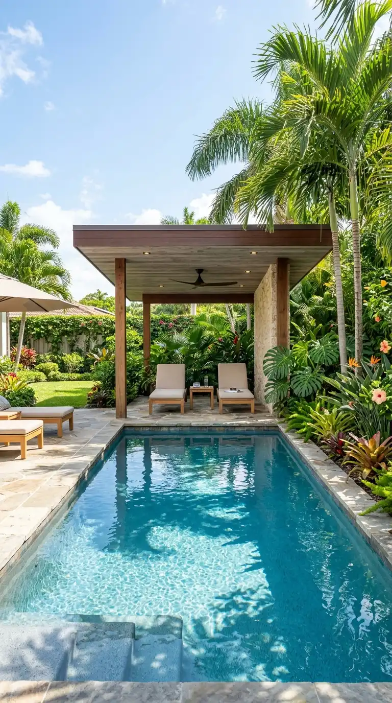 A poolside pavilion provides shade and comfort for swimmers and loungers. Design a structure with a roof that extends over a lounge area, leaving the front open to the pool. Use materials that resist moisture and heat, such as aluminum, teak, or composite. Add comfortable lounge furniture, a ceiling fan for cooling breezes, and outdoor curtains for optional privacy. A poolside pavilion creates a resort-like atmosphere in your own backyard.