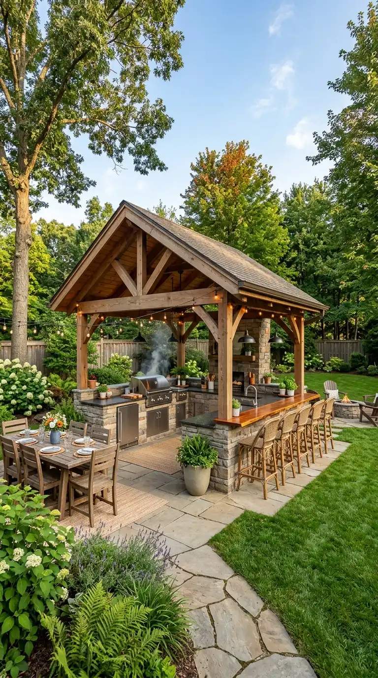 Design a pavilion that serves as the hub of your outdoor entertaining by integrating a full outdoor kitchen. Include a built-in grill, sink, refrigerator, and counter space under the shelter of the roof. Add a bar with seating for casual dining, and position a dining table nearby. The pavilion provides shade and protection for the kitchen and dining areas, making outdoor cooking and entertaining comfortable in any weather.