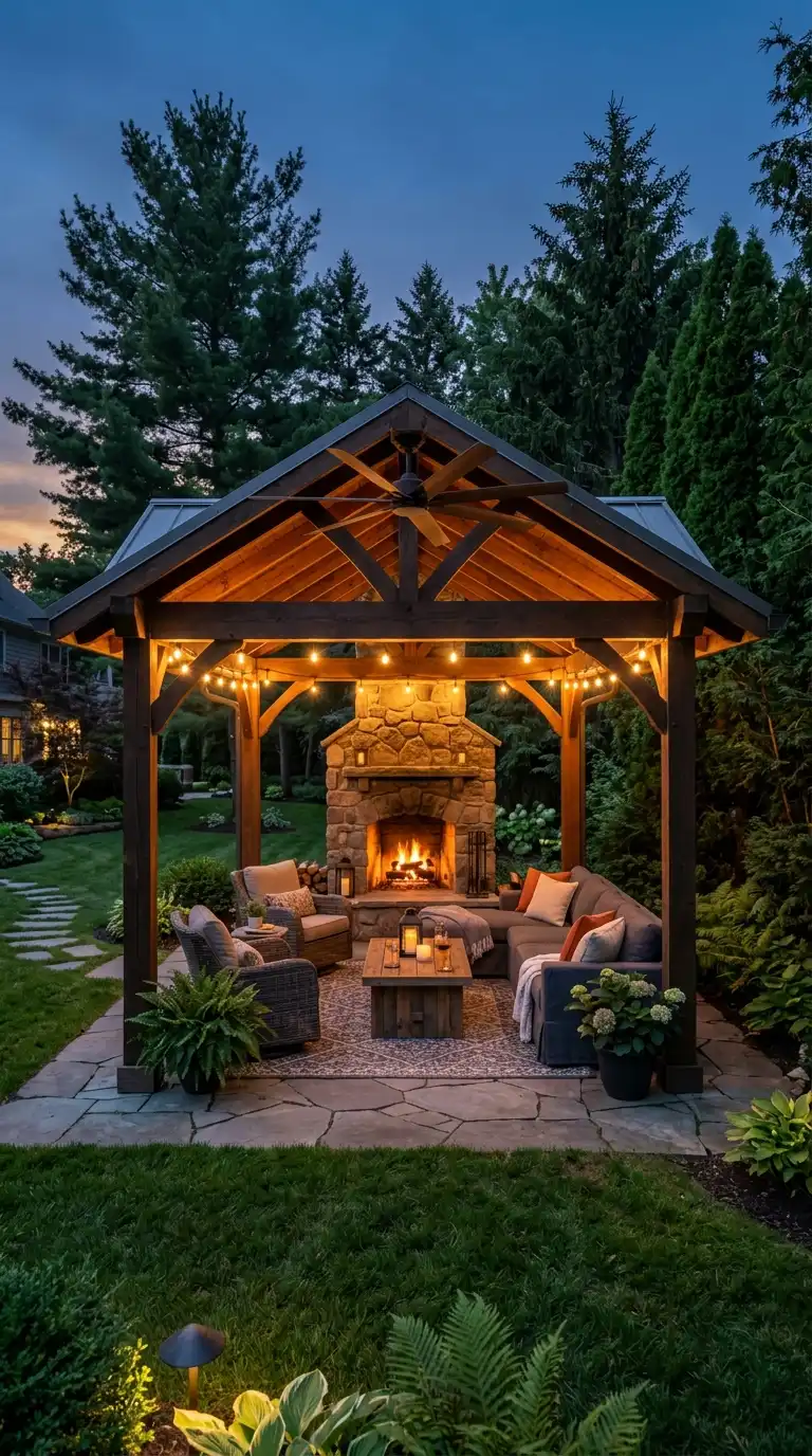Create a cozy gathering spot with a pavilion that incorporates a built-in fireplace. The fireplace becomes a focal point, providing warmth and ambiance for cooler evenings. Use stone or brick for the fireplace surround, and arrange comfortable seating around it. The pavilion roof provides shelter, while the open sides allow the fire’s warmth to radiate outward. This design extends the usability of your outdoor space into the cooler months.
