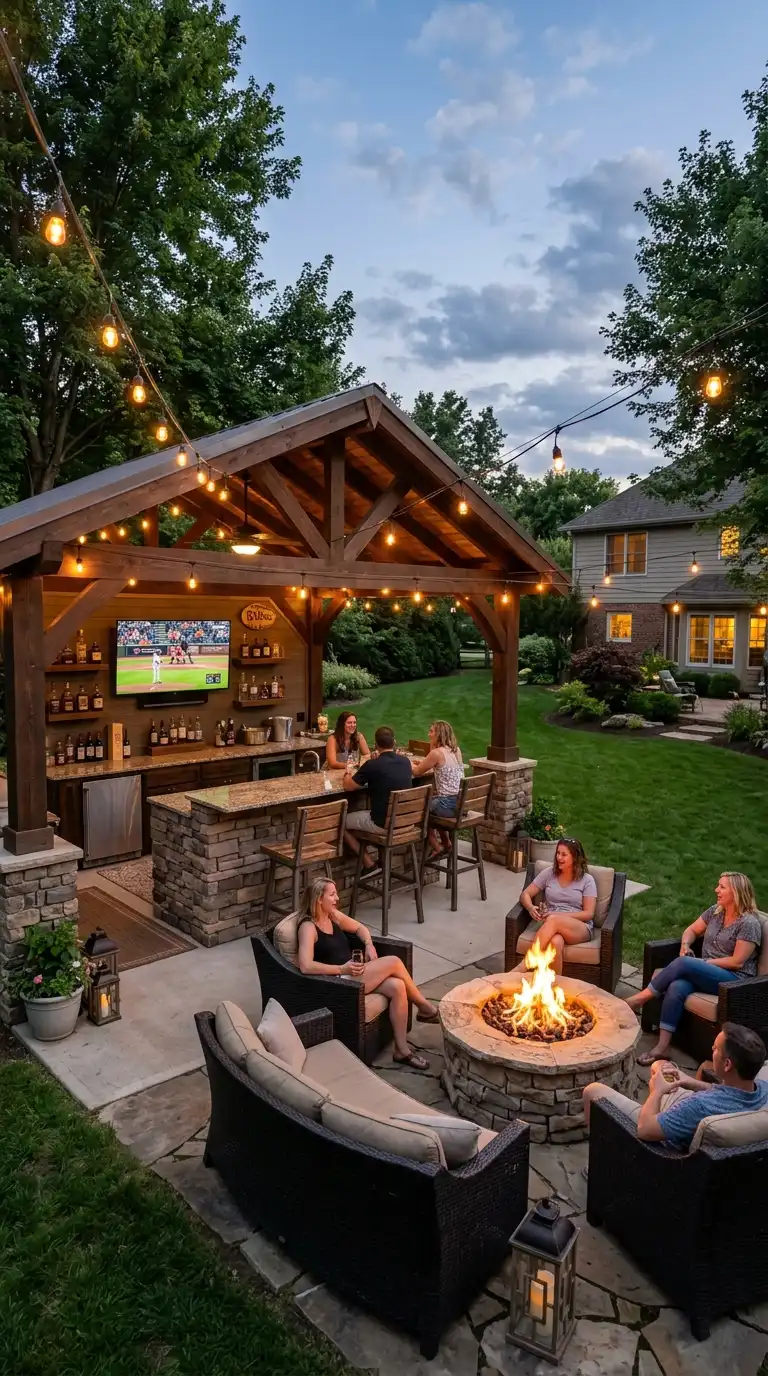 Design a pavilion dedicated to entertaining with a built-in bar, entertainment center, and ample seating. Include a counter with bar stools, a refrigerator, ice maker, and storage for glassware. Add a television or projector screen for movie nights or game days. The pavilion becomes an outdoor entertainment hub perfect for hosting gatherings of any size.