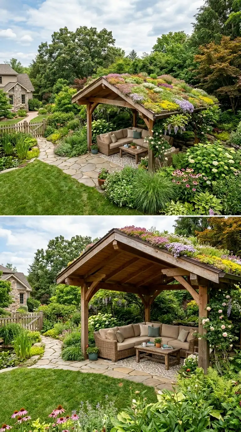 A living roof or green roof adds natural beauty, insulation, and environmental benefits to your pavilion. Plant sedum, grasses, or low-growing perennials on a waterproof membrane over the roof structure. The green roof blends the pavilion into the landscape, reduces stormwater runoff, and provides habitat for pollinators. This design is ideal for eco-conscious homeowners and modern, naturalistic landscapes.