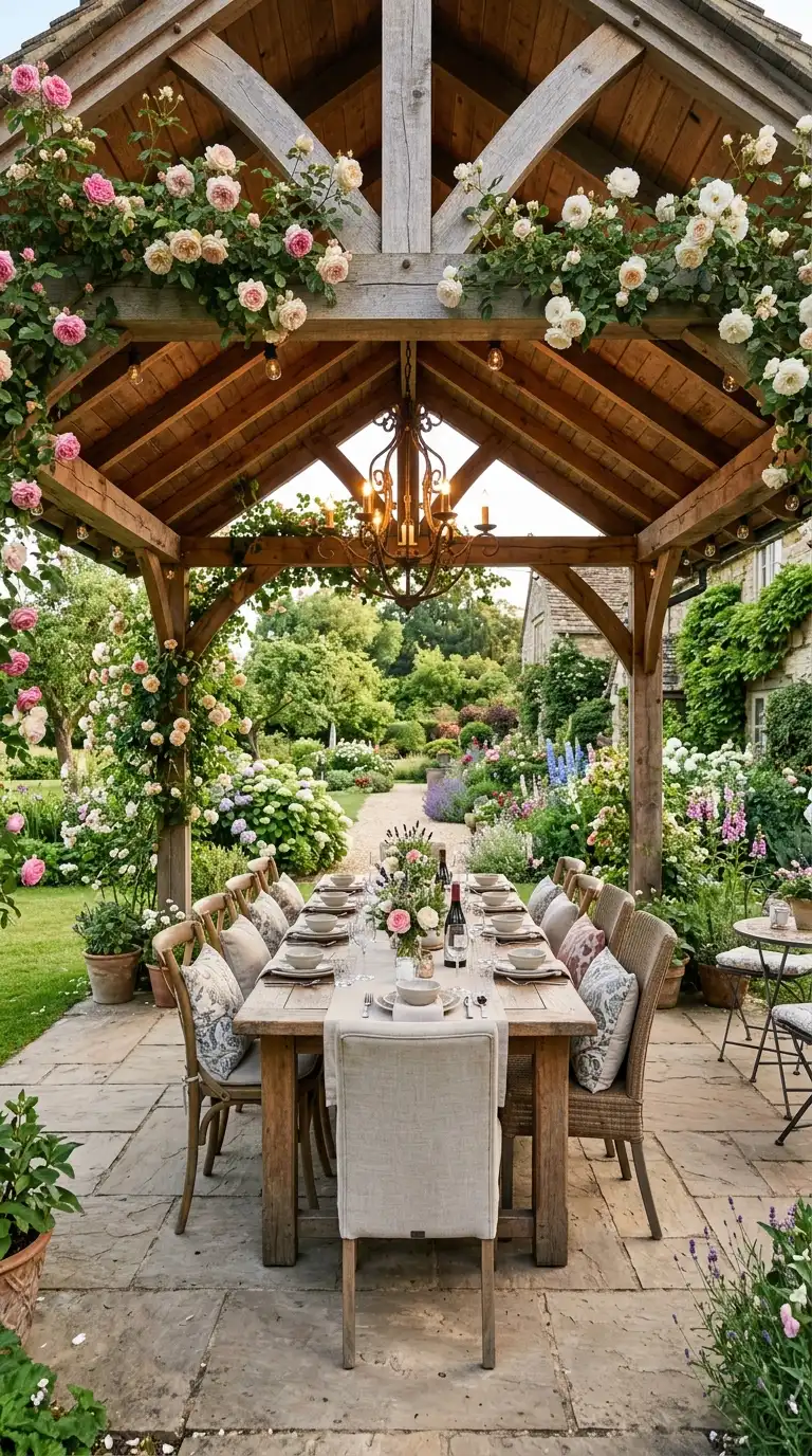 Design a pavilion specifically for al fresco dining, with a large table, comfortable chairs, and a chandelier or pendant lighting for evening meals. The open sides allow for airflow and views, while the roof provides shade and shelter. Position the pavilion to capture a garden view or overlook a pool, and add plantings around the base to integrate it into the landscape.