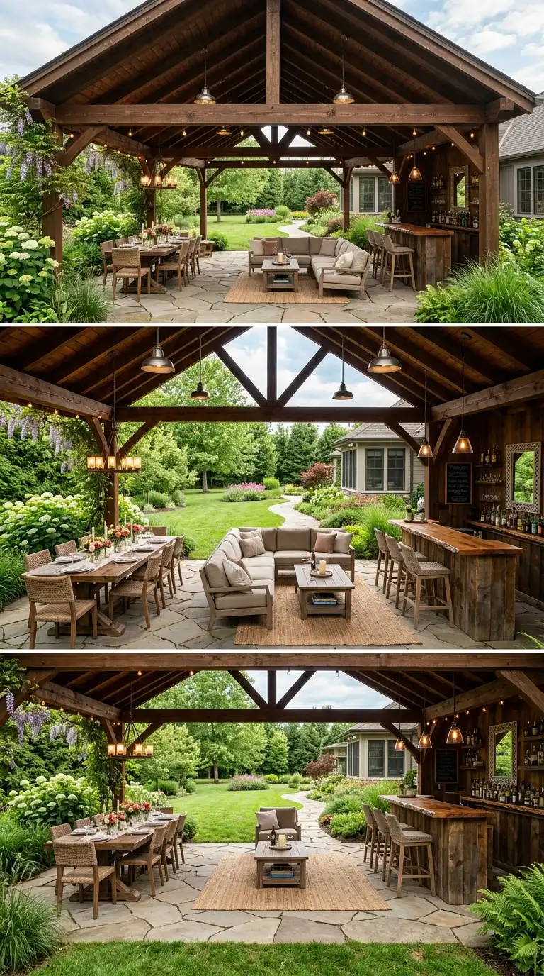 Create a versatile pavilion that accommodates multiple activities with distinct seating zones. Designate one area for dining with a table and chairs, another for lounging with comfortable sofas and a coffee table, and a third for a bar or beverage station. The pavilion becomes a self-contained outdoor living space that can host gatherings of all kinds.