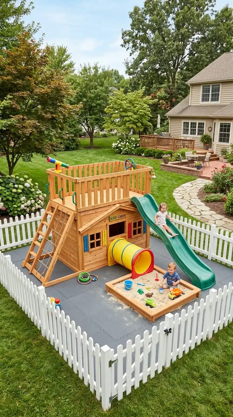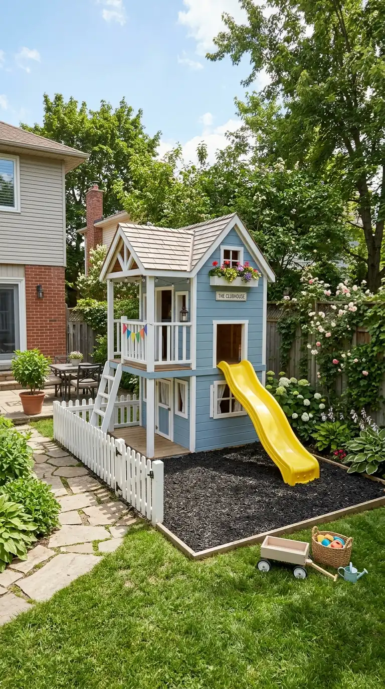 For smaller yards, a compact playhouse with an attached slide maximizes fun in a limited footprint. The playhouse can include a small deck, a ladder or steps, and a covered area for imaginative play. A wave slide or tube slide adds excitement. Use bright, cheerful colors to make it a focal point, or choose natural wood tones to blend with the landscape. This design is perfect for toddlers and young children.