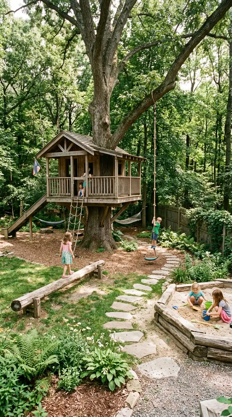 A natural playground uses logs, boulders, tree stumps, and other organic materials to create a play space that blends with the landscape. Include a balance beam made from a fallen log, stepping stones, a rope climb, and a sand pit with natural borders. A treehouse built into an existing tree adds a magical element. This design encourages children to engage with nature and use their imagination.
