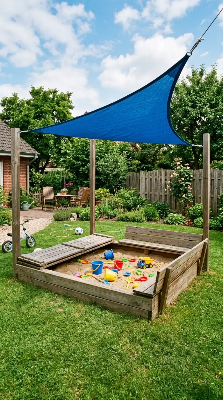 A sandbox is a simple but beloved playground feature. Elevate it by adding a shade sail or umbrella to protect children from the sun. Use a wooden frame with rounded corners and a cover to keep animals out when not in use. Add a small bench or seating around the edge for parents to supervise. Include sand toys, buckets, and shovels.