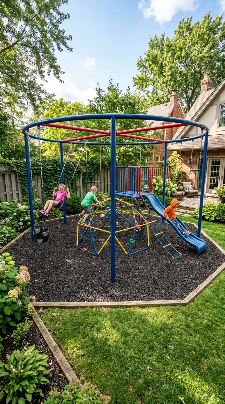 A circular swing set surrounds a central climbing structure, making efficient use of space. The swings are arranged around the perimeter, while the center holds a climbing dome, a slide, and a small platform. This design is ideal for smaller yards where a traditional linear swing set might not fit.