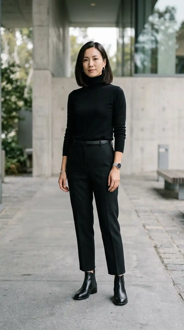 A black turtleneck paired with tailored trousers creates a sleek, sophisticated silhouette that works for work, dinner, or evening events. The monochrome palette is clean and modern, while the fit and fabric elevate the simplicity. Add black leather loafers or ankle boots for a polished finish.