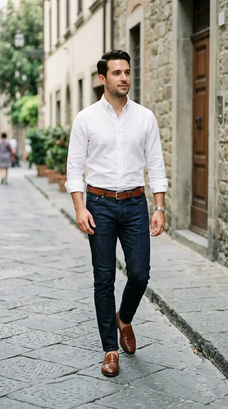 A crisp white button-down shirt tucked into dark wash jeans is a classic combination that never goes out of style. Roll the sleeves for a casual feel, or leave them buttoned for a more polished look. Add brown leather loafers and a simple belt for a refined, versatile outfit suitable for work or weekends.