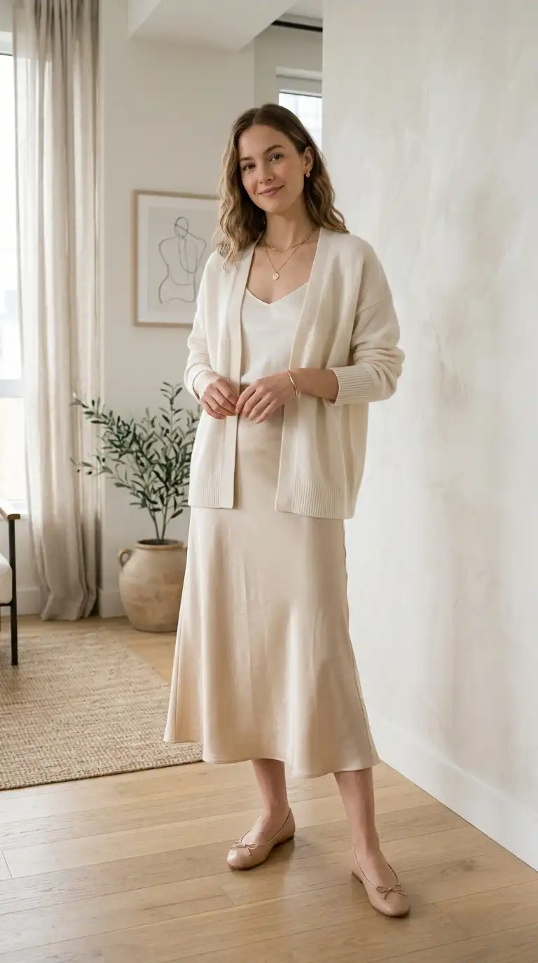 Soft textures and clean lines define this minimalist outfit. A cashmere cardigan paired with a silk midi skirt creates a look that is both luxurious and understated. Choose neutral tones—cream and champagne, or gray and black—for maximum versatility. Add simple sandals or ballet flats.