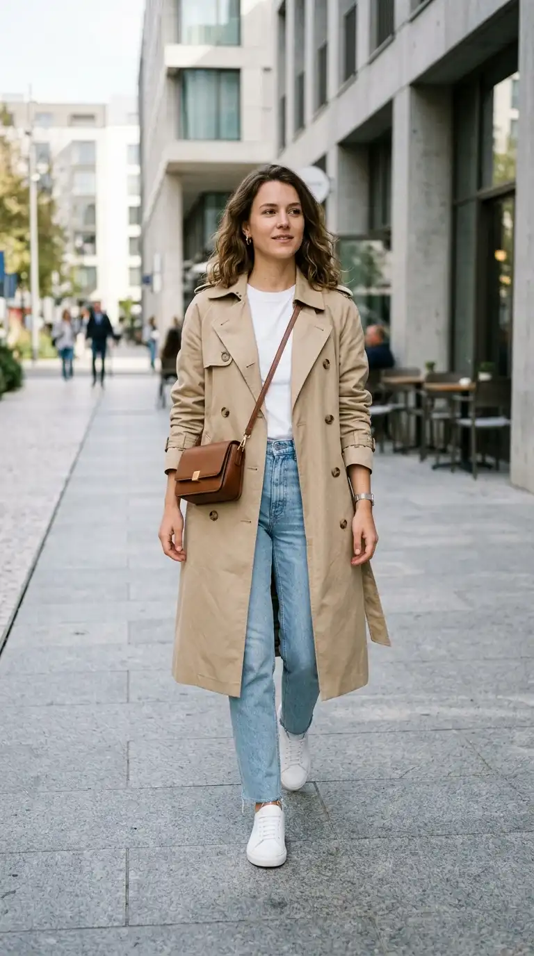A classic trench coat layered over a white t-shirt and jeans is the epitome of effortless style. The trench adds structure and sophistication to the casual foundation, making it suitable for everything from weekend errands to travel. Roll the sleeves for a relaxed feel, and finish with white sneakers or leather ankle boots.