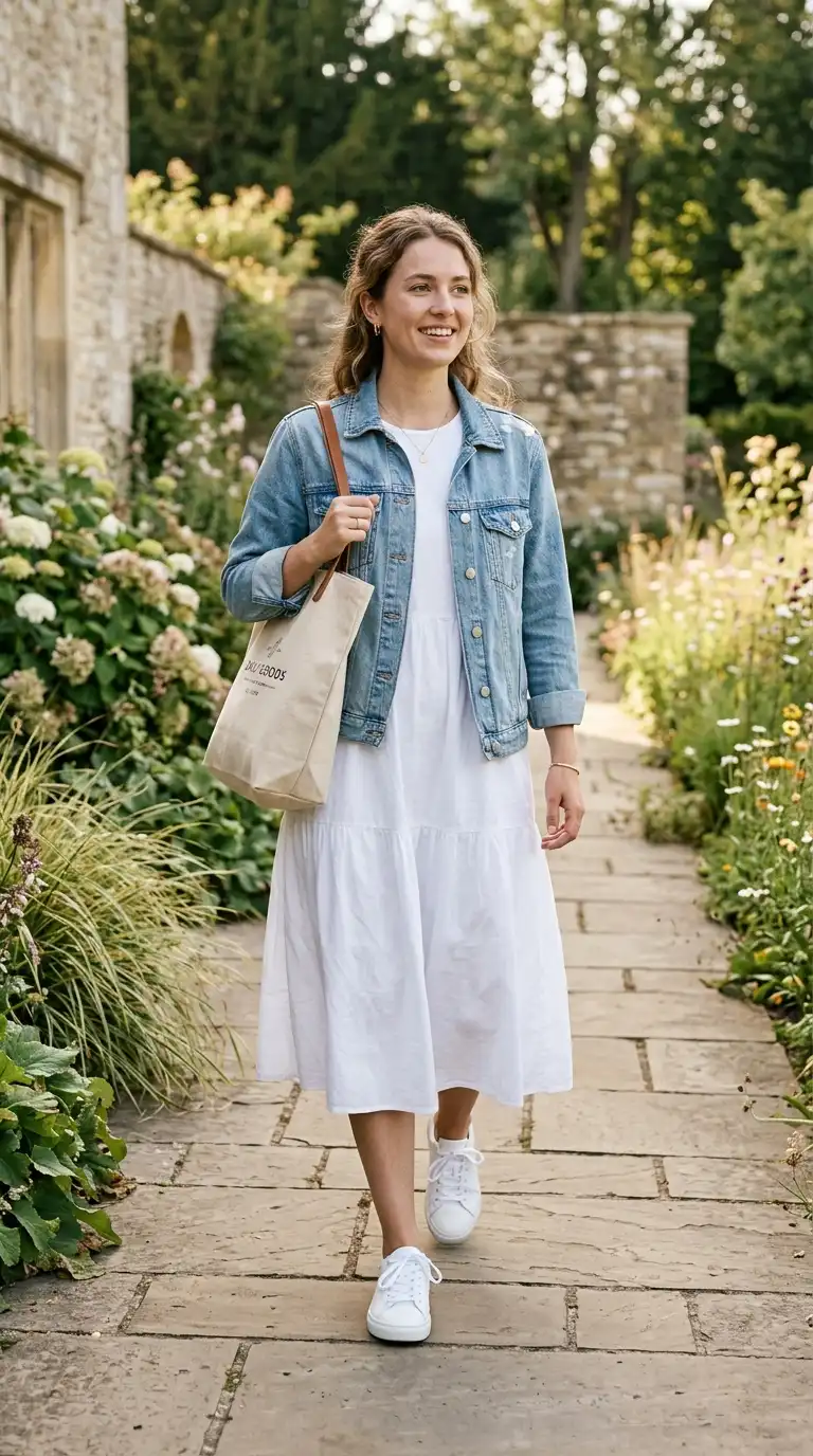 A denim jacket layered over a simple white dress creates a fresh, casual look perfect for spring and summer. The combination is relaxed yet put-together, and the denim adds texture and structure to the soft dress. Finish with white sneakers or leather sandals.