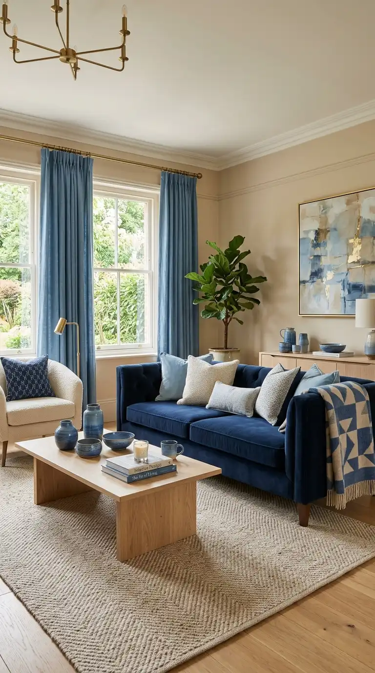 Layering multiple shades of blue with beige creates depth and interest while maintaining a serene, cohesive palette. Think navy blue sofa, medium blue curtains, powder blue pillows, and beige walls and rug. The variety of blue values—from deep navy to soft powder—creates visual richness while beige provides warmth and breathing room throughout. Natural textures like wood, jute, and linen enhance the organic feel.