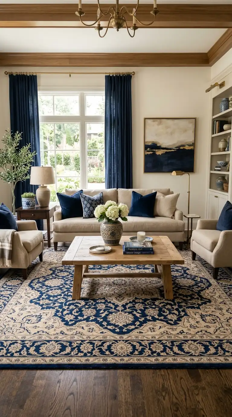 A patterned area rug in blue and beige anchors your seating area while adding pattern and definition. Choose designs that blend the two colors harmoniously—traditional Persian motifs, geometric patterns, abstract prints, or tribal designs. The rug becomes the foundation for your furniture while establishing the room’s color palette and adding visual interest underfoot.