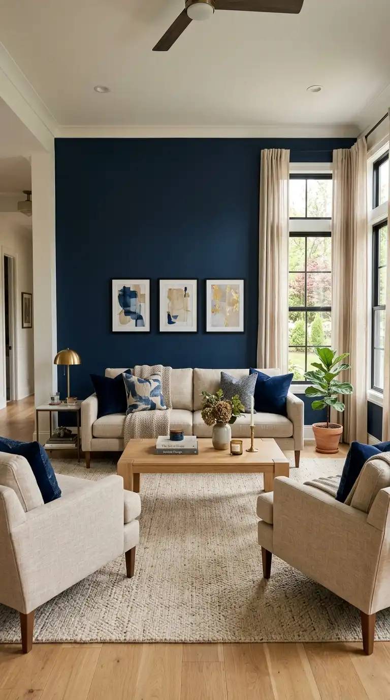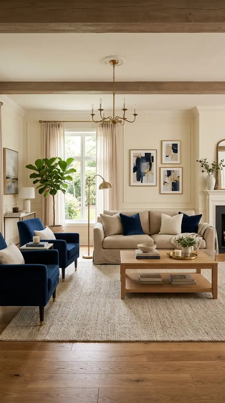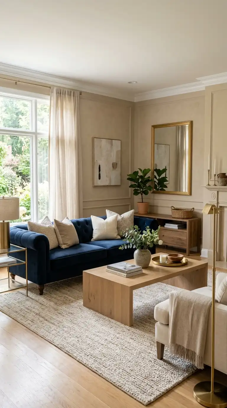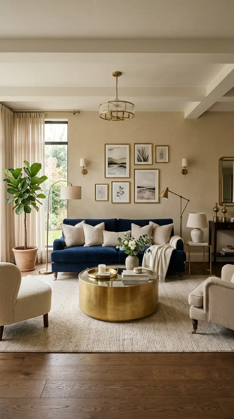 Dark blue, warm beige, and brass create a sophisticated, luxurious palette that feels both grounded and glamorous. The deep blue provides dramatic foundation, beige adds warmth and neutrality, and brass introduces elegance and shine. This combination works beautifully in formal living rooms, traditional spaces, and rooms designed for entertaining.