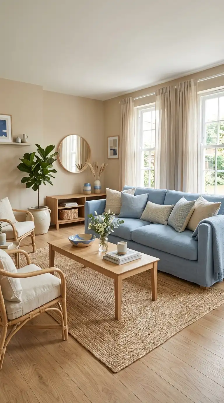 Don’t forget about natural elements. Wood, jute, rattan, and greenery add organic texture that enhances the blue and beige palette beautifully.