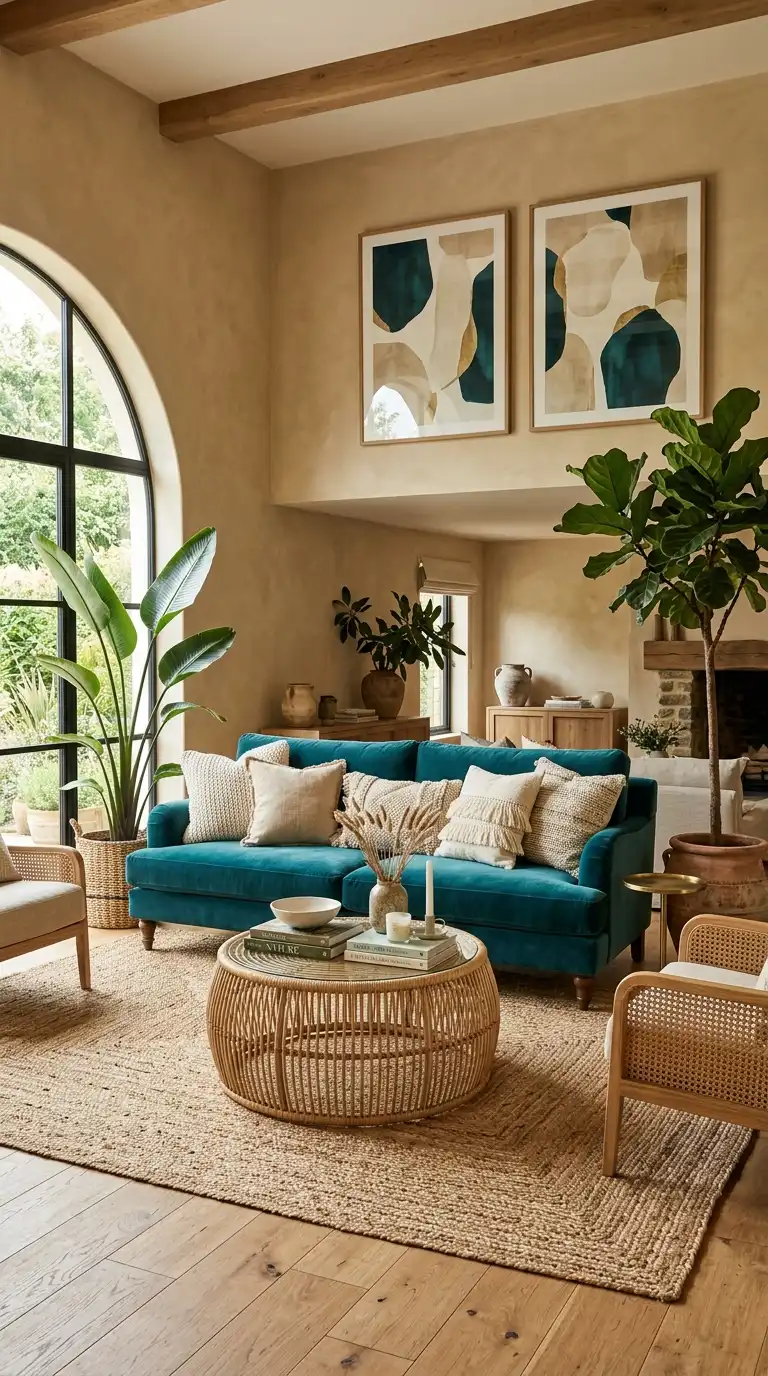 A teal sofa paired with tan beige walls creates a rich, organic palette inspired by nature. The blue-green teal provides depth and personality while tan beige adds warmth and grounding. This combination works beautifully in eclectic, bohemian, and transitional living rooms. Add natural textures like jute, rattan, and wood to enhance the organic feel.