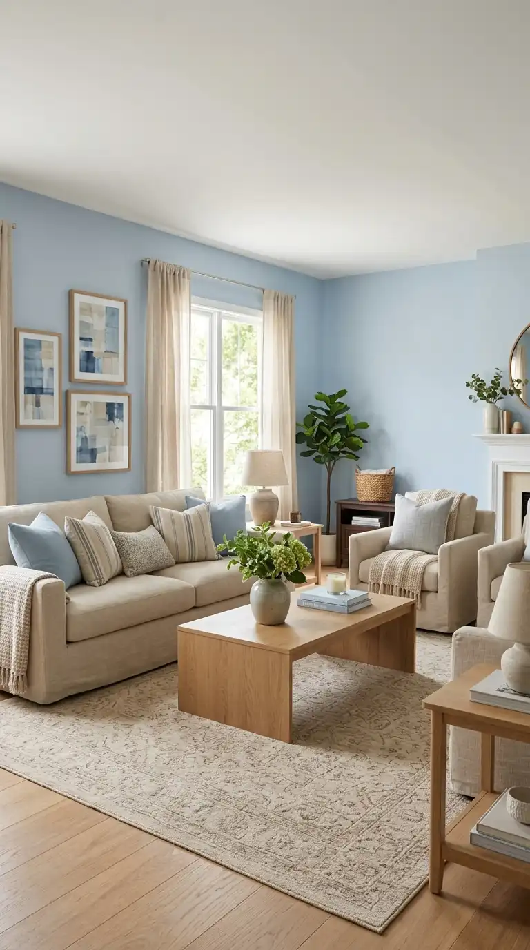 A powder blue sofa against beige walls creates a soft, serene atmosphere that feels fresh and calming. The gentle blue provides subtle color while beige adds warmth and neutrality. This combination works beautifully in coastal, cottage, and casual living rooms where relaxation is key. Layer with cream and beige textiles for a cohesive, soothing palette.