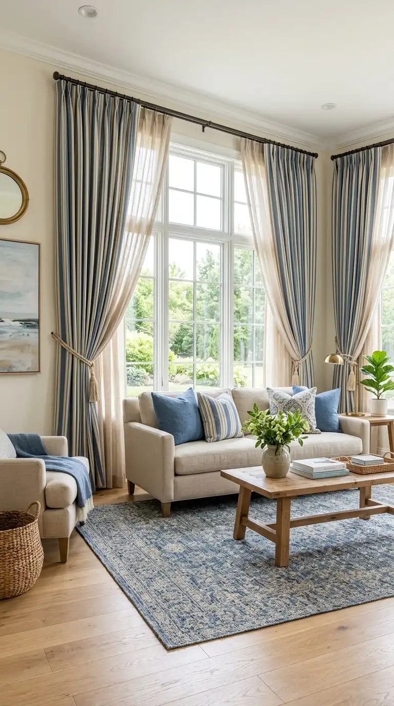 Striped curtains in blue and beige add pattern and movement while establishing your color palette. Vertical stripes draw the eye upward, making ceilings appear higher. Choose the scale of stripes based on your room size—larger stripes for grand spaces, smaller pin stripes for intimate rooms. Beige sheers beneath add softness and light diffusion.