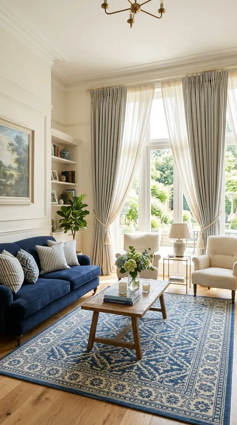 Striped curtains in blue and cream add pattern and movement while maintaining a classic, timeless appeal. Vertical stripes draw the eye upward, making ceilings appear higher. Choose the scale of stripes based on your room size—larger stripes for grand spaces, smaller pin stripes for intimate rooms. Cream sheers beneath add softness and light diffusion.