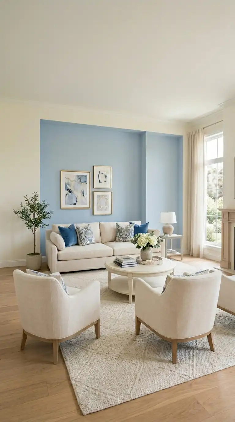 A blue accent wall provides soft color without overwhelming the room, while cream furniture keeps the palette light and airy. Choose your perfect shade of blue—navy for drama, powder for softness, teal for uniqueness—and paint one wall as a focal point. Furnish the room primarily in cream, with blue accents in accessories that echo the accent wall.