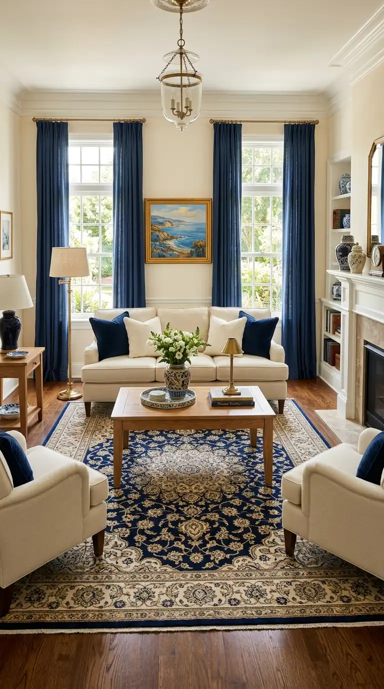 Use the 60-30-10 rule for balanced color distribution. Let cream dominate about 60 percent of the room (walls, larger furniture). Use blue for about 30 percent (sofa, curtains, area rug). Add accents in both colors and metallics for the remaining 10 percent.