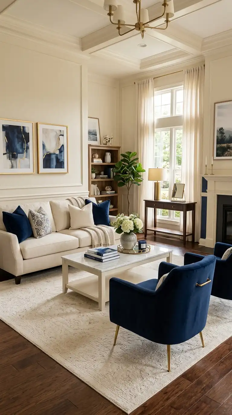 Adding gold or brass accents to a navy and cream living room introduces warmth and luxury that elevates the entire space. The warm metallics pop against the classic palette, creating points of light and interest. Introduce gold through lighting fixtures, coffee table bases, mirror frames, picture frames, or decorative accessories.