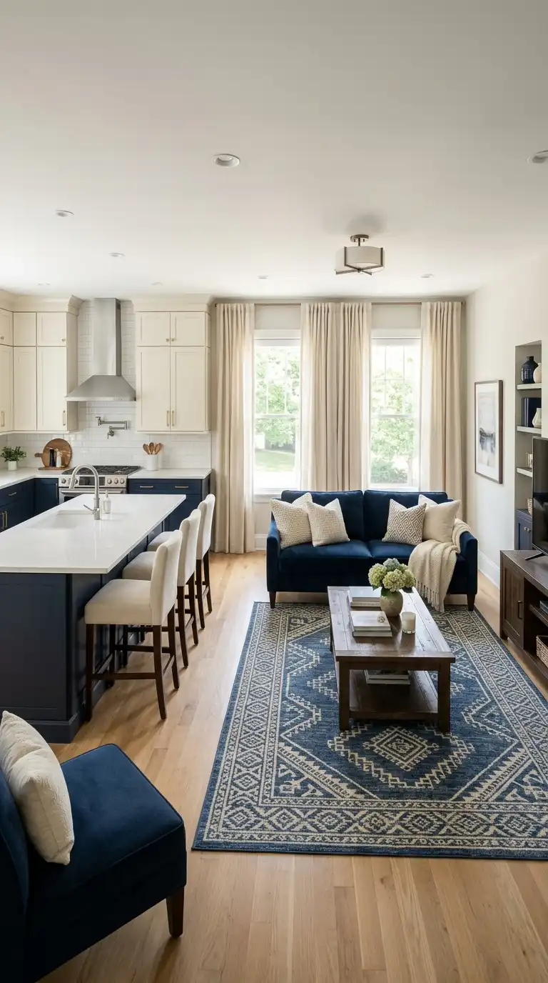 For open concept homes where the living room flows into the kitchen, a blue and cream kitchen creates a stunning visual connection. Cream cabinetry with blue island, or blue upper cabinets with cream lowers, provides continuity with the living area’s palette. In the adjacent living space, carry the colors through in sofas, curtains, and accessories for seamless flow between zones.