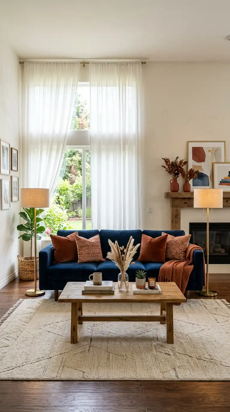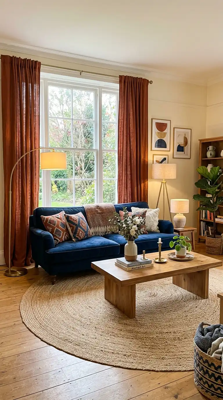 Sheer white or cream curtains provide a soft, neutral contrast. Linen curtains in natural tones add texture while maintaining a relaxed feel. Patterned curtains that incorporate both blue and rust tie the palette together beautifully. Rust curtains against blue furniture create bold, dramatic framing. - Can blue and rust work in a small living room?