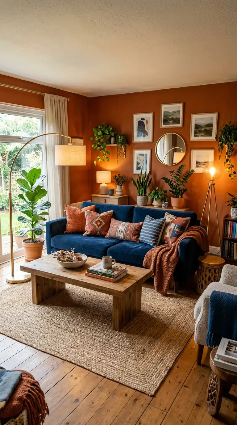Rust walls create a warm, earthy backdrop that makes blue furniture stand out with striking contrast. The rich, terracotta-inspired hue adds depth and energy, while a navy blue or teal sofa becomes a stunning focal point. Pair with natural wood furniture and woven textures to enhance the organic feel. Brass or copper accents reinforce the warmth of the rust, while sheer curtains allow natural light to soften the intensity of the walls.