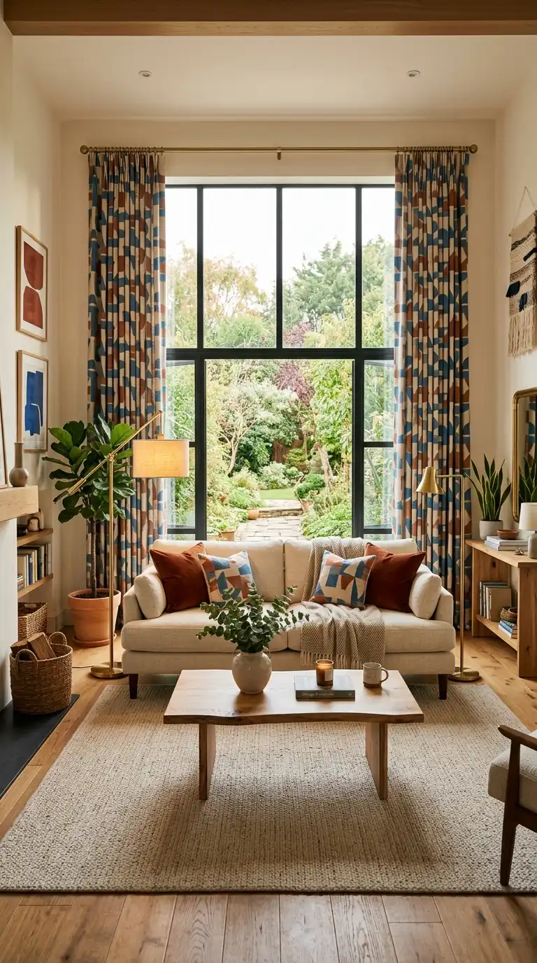 Geometric patterned curtains in blue and rust add visual interest and serve as a dynamic focal point. The pattern ties the color palette together while introducing movement and energy. Keep the rest of the room neutral with a cream or gray sofa, and pull accent colors from the curtains for pillows and accessories. A brass curtain rod enhances the warmth of the rust tones, while sheer white panels layered beneath add softness and light diffusion.