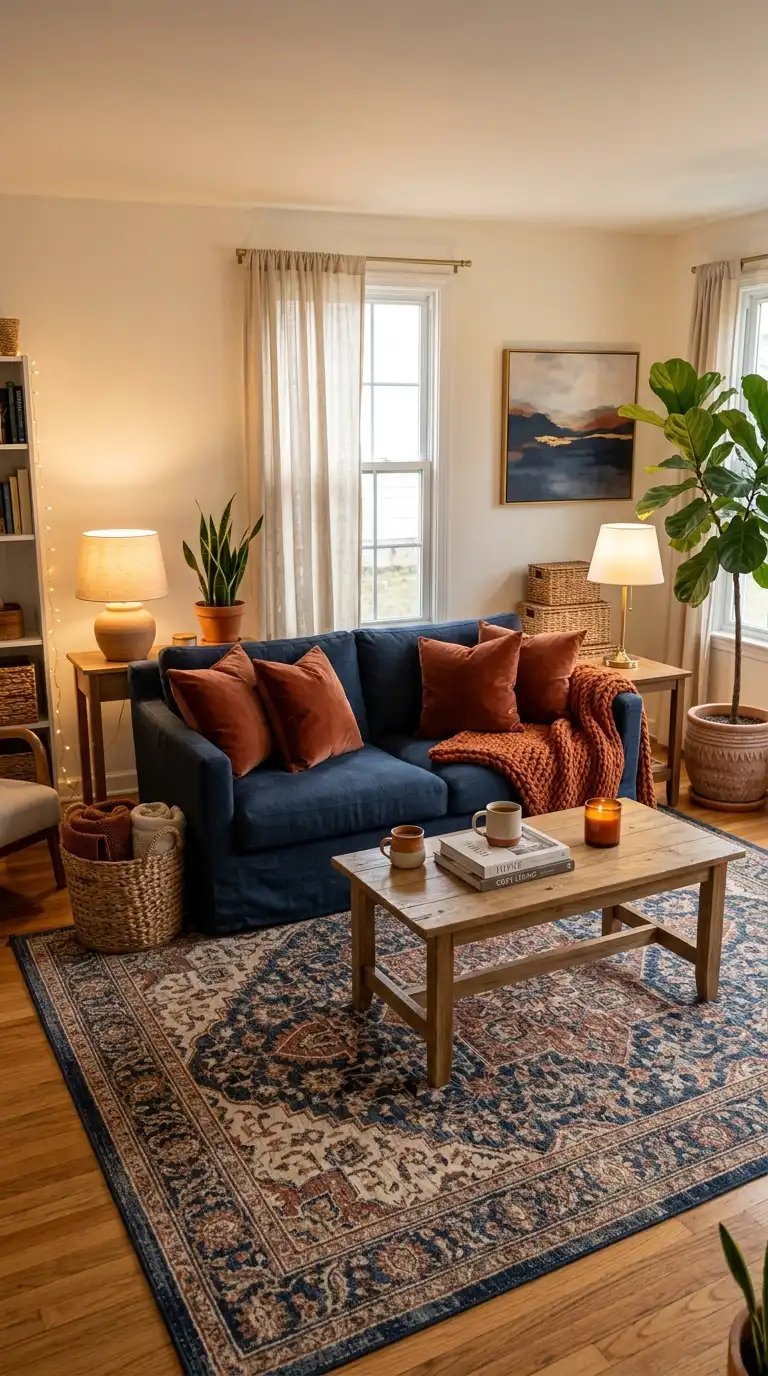 Layering textiles in blue and rust creates depth, warmth, and visual interest in a living room. Use a blue sofa as the foundation, and add rust-colored throw pillows, a rust chunky knit blanket, and a blue and rust patterned area rug. The combination of textures—velvet, wool, linen—adds richness and prevents the palette from feeling flat. Natural wood furniture and woven baskets enhance the organic feel, while potted plants bring life and freshness to the space.