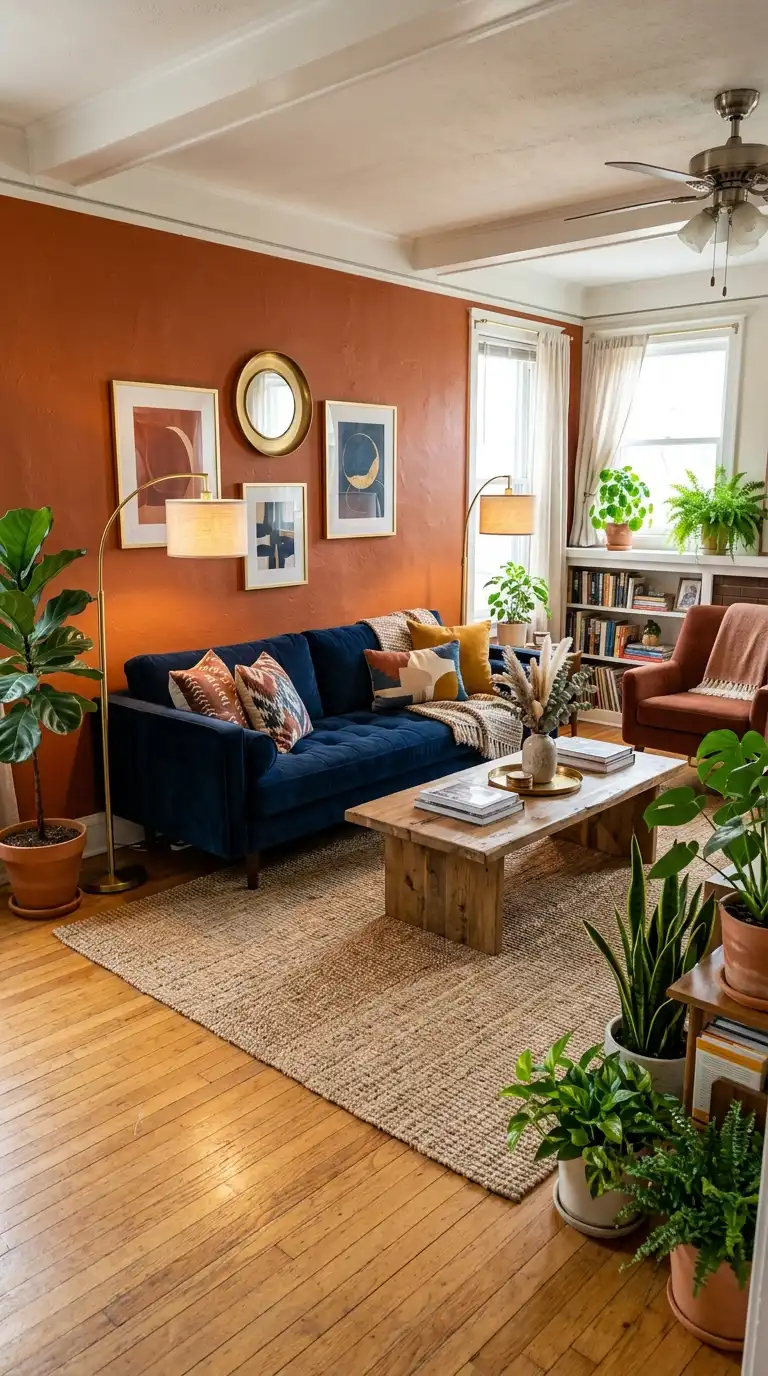 A rust accent wall adds warmth and drama to a living room, serving as a stunning backdrop for blue furniture. Whether you choose a navy blue sofa, a pair of sky blue armchairs, or a teal sectional, the blue stands out beautifully against the warm rust-colored wall. Add natural wood accents, woven textures, and plenty of greenery to complete the grounded, inviting look. Brass or copper lighting enhances the warmth of the rust while complementing the cool blue.