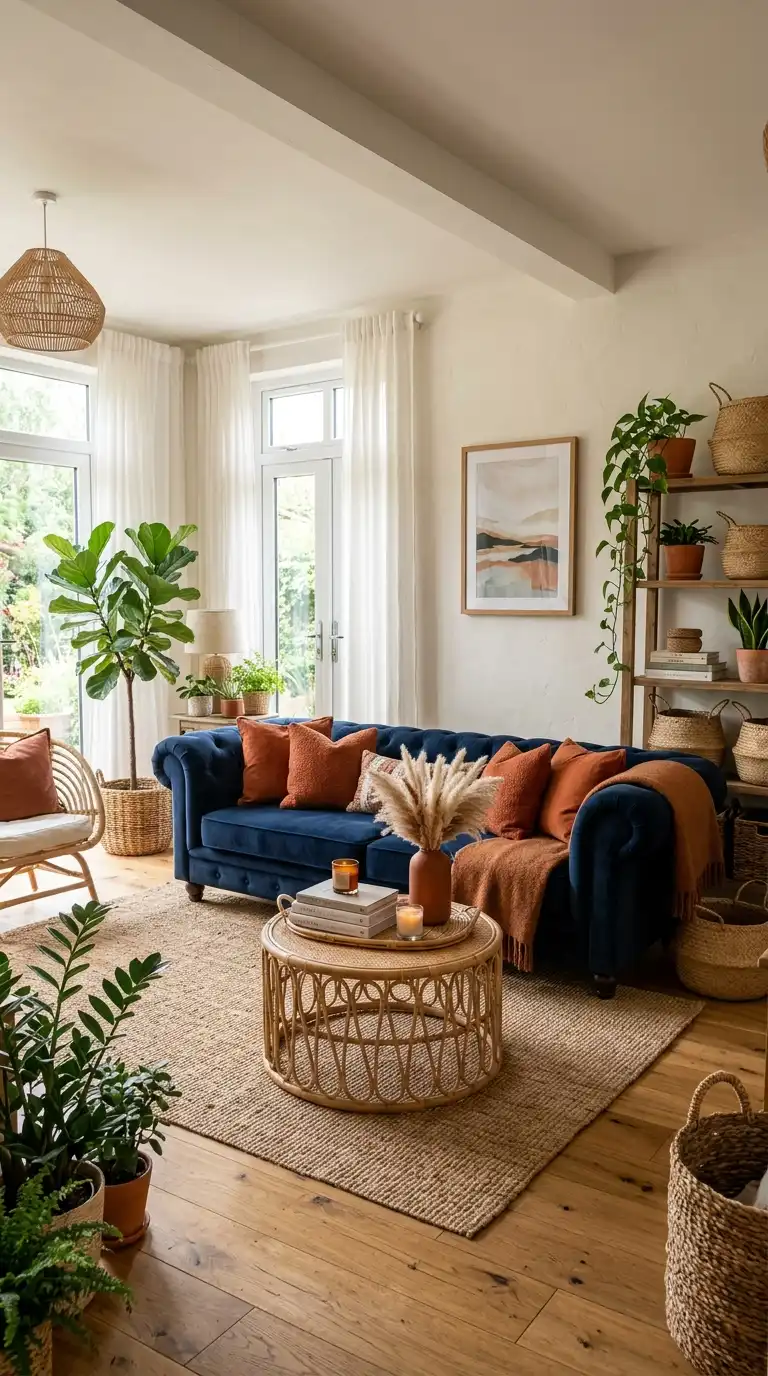 Natural wood and rattan textures enhance the earthy quality of a blue and rust palette. Use a blue sofa as the foundation, and add rust accents through pillows, vases, or a rug. Incorporate a rattan coffee table, woven baskets, and wooden shelving to add warmth and organic texture. This combination works beautifully in bohemian, coastal, and Scandinavian-inspired interiors where natural materials take center stage. Potted plants and dried botanicals complete the grounded, nature-inspired aesthetic.