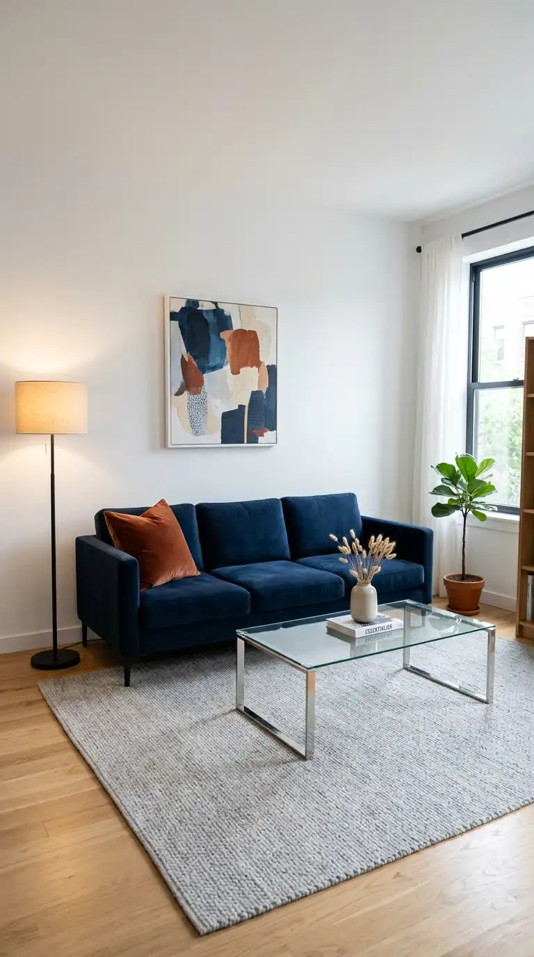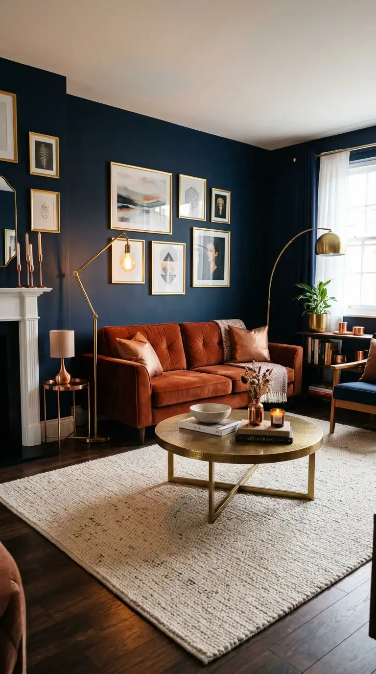 A navy blue velvet sofa provides a rich, sophisticated foundation that allows rust-colored accents to shine with warmth. The deep blue grounds the space while rust adds vibrancy and energy. Introduce rust through throw pillows, a cozy blanket, a statement armchair, or a ceramic vase. Brass or gold accents in lighting and coffee tables enhance the warmth of the rust while complementing the cool blue. A cream or light gray rug keeps the space feeling balanced and bright.