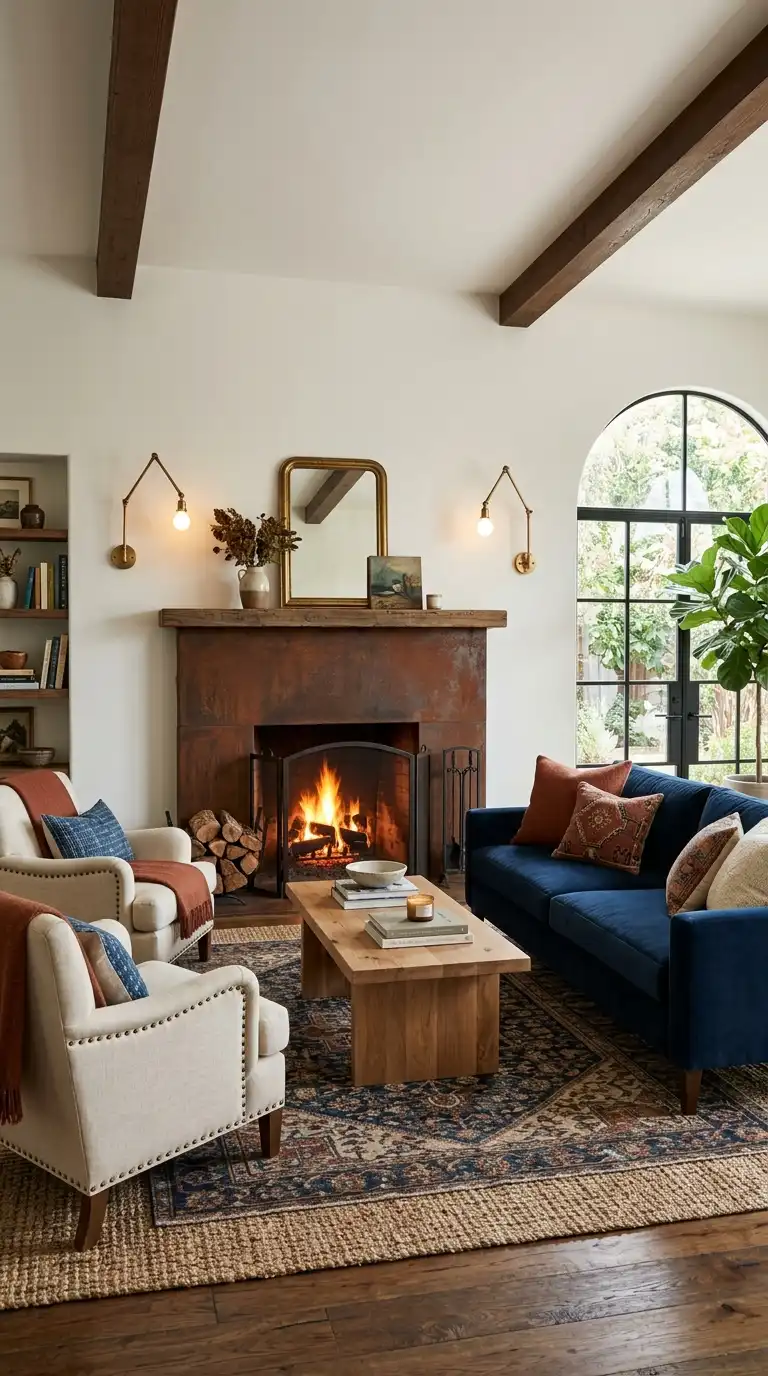 A fireplace provides the perfect anchor for a blue and rust living room. Paint the fireplace surround or accent wall in rust, and arrange blue furniture around it for a balanced, inviting layout. The warm rust draws attention to the hearth while the cool blue seating creates a cozy, grounded atmosphere. Add natural wood accents, warm lighting, and plenty of texture to complete the look. A crackling fire enhances the warmth of the rust and makes the space feel instantly inviting.
