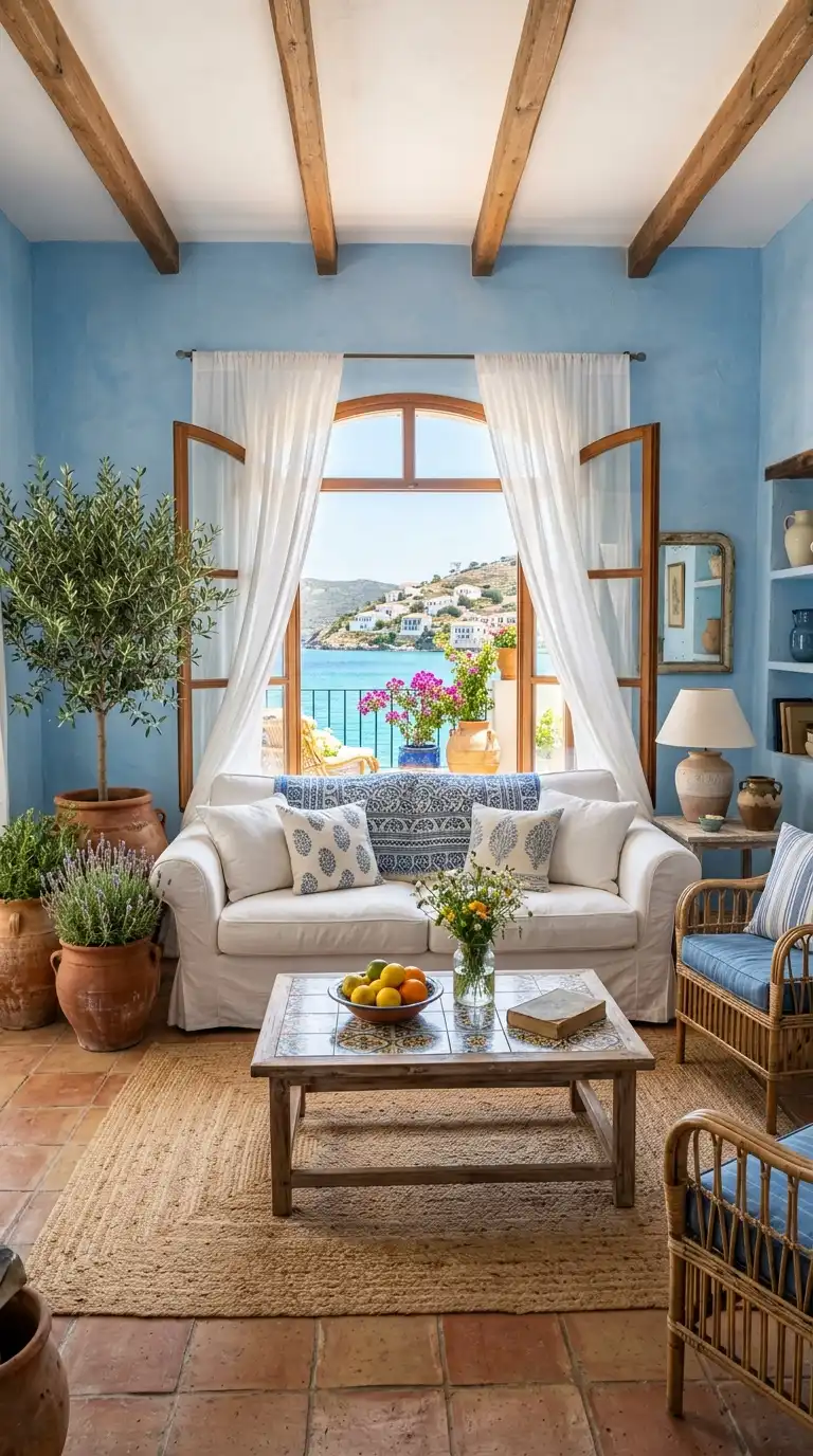 Sky blue and rust create a warm, Mediterranean-inspired palette reminiscent of Greek villages and Italian coastal towns. Use sky blue on walls or a sofa, and introduce rust through clay pots, terracotta tiles, or rust-colored textiles. Add whitewashed walls, natural wood furniture, and plenty of greenery—olive trees, lavender, or trailing vines—to complete the sun-drenched aesthetic. This combination feels relaxed, inviting, and full of old-world charm, perfect for spaces that celebrate rustic elegance and coastal beauty.