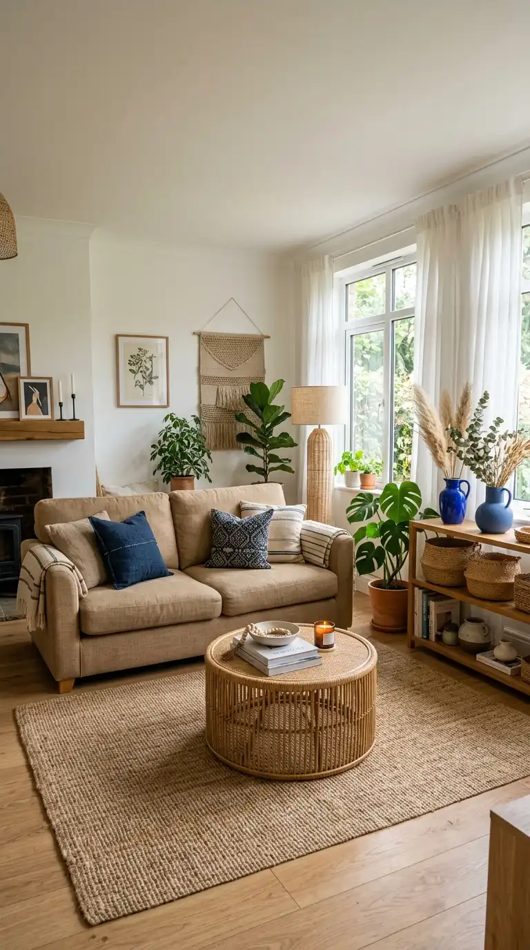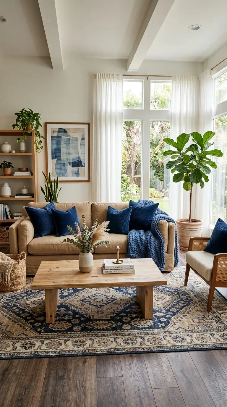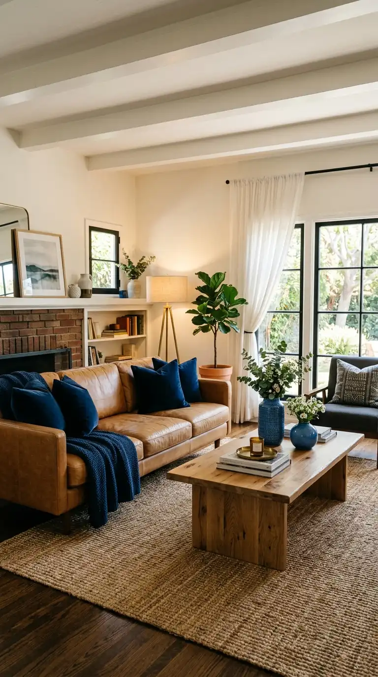 Natural wood and rattan textures enhance the earthy quality of a blue and tan palette. Use a tan sofa or tan leather armchairs as the foundation, and add blue accents through pillows, curtains, or a rug. Incorporate a rattan coffee table, woven baskets, and wooden shelving to add warmth and organic texture. This combination works beautifully in bohemian, coastal, and Scandinavian-inspired interiors where natural materials take center stage. Potted plants and dried botanicals complete the grounded, nature-inspired aesthetic.