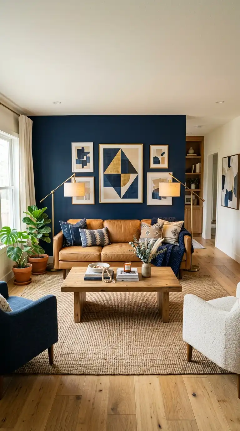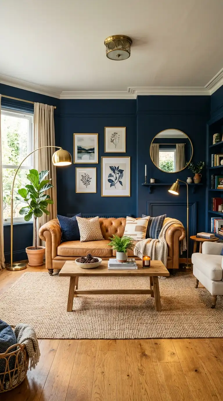 Navy blue walls create a dramatic, sophisticated backdrop that makes tan furniture stand out with striking warmth. A tan leather sofa, tan linen armchairs, or a tan ottoman become inviting focal points against the deep blue. The cool blue and warm tan balance each other beautifully, creating a space that feels both elegant and grounded. Pair with brass or gold accents to add warmth and elegance, and incorporate natural wood elements to enhance the organic feel.