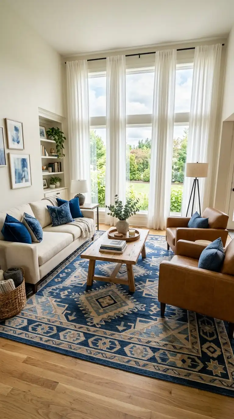 A geometric patterned rug in blue and tan anchors the seating area and establishes the room’s color palette. The bold pattern adds visual interest and movement while tying the two colors together seamlessly. Keep furniture neutral—a cream sofa, tan armchairs—to let the rug serve as the focal point. Pull accent colors from the rug into pillows and accessories for a cohesive, intentional design. This approach allows you to incorporate the blue and tan palette without committing to painted walls or large furniture pieces.