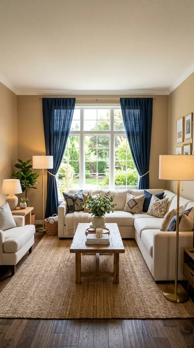 Blue curtains against tan walls create a balanced, inviting look. The warm tan provides a neutral foundation while the blue adds a cool pop of color and sophistication. Choose curtains in navy, sky blue, or teal, and pair with neutral furniture in cream or beige. A natural wood coffee table and jute rug enhance the organic feel, while brass curtain rods add warmth and elegance. This approach works beautifully in coastal, traditional, and transitional interiors.