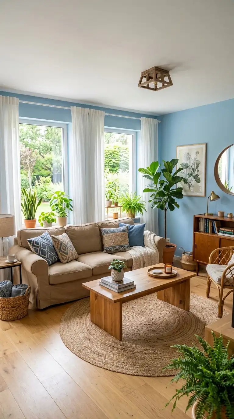 Blue and tan create a relaxed coastal palette reminiscent of sand and sea. Use sky blue or soft blue on walls or a sofa, and pair with tan linen furniture, a jute rug, and rattan accents. The combination evokes the colors of the beach—blue water, tan sand—creating a space that feels calm, breezy, and effortlessly inviting. Add white slipcovered furniture, woven baskets, and plenty of greenery to complete the coastal aesthetic. Sheer white curtains allow natural light to fill the room.